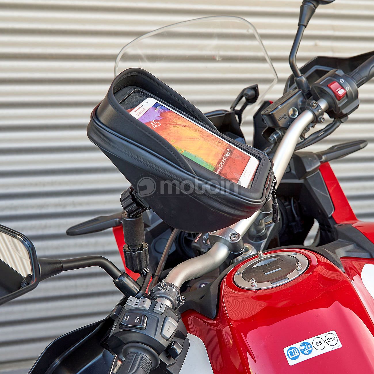 Ruitkijkspiegelhouder voor smartphones met extra vak. Geldig voor de meeste motorfietsen. Hiermee kun je de houder eenvoudig en snel aan de achteruitkijkspiegel bevestigen, dankzij de universele verstelbare bevestiging, zelfs met handschoenen.