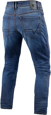 REV'IT! weiß, dass nicht jeder die gleiche Beinlänge hat, daher ist die mitgelieferte Knieschutztasche in zwei verschiedenen Höhen verstellbar. Diese Motorradjeans gibt es in zwei Farbvarianten: gewaschen, mit 3D-Crinkles und in einem mittleren Blau.