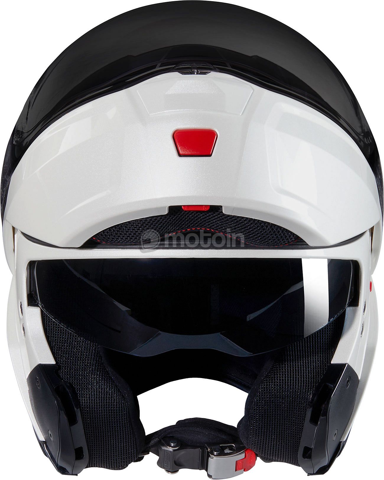 Exclusive Dual Action chin guard opening system. Positioned in the center of the chin guard, it allows for easy, one-handed opening. The dual action opening mechanism reduces the risk of accidental opening: the chin guard can be opened only operating the first release lever (or safety lock) and then activating the second lever.