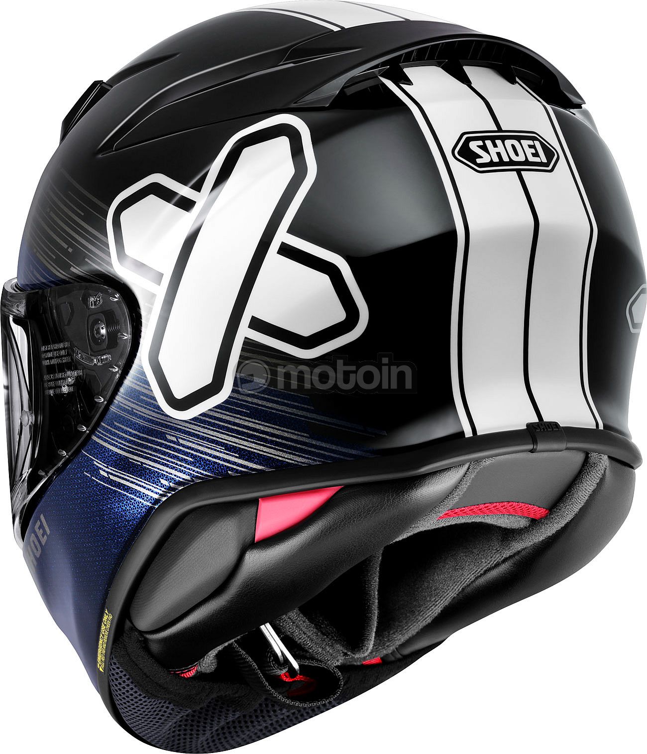 Shoei has taken its own approach to designing the padding. The helmet's styrofoam core is molded close around the rider's head. This allows thinner pads to be used. These are produced in a complex process from several layers of polyurethane foam in different hardnesses or by a three-dimensional cut from a block.