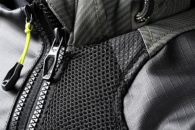 Udover den store kængurulomme foran er der også en stor lomme nederst på ryggen. Lidt højere finder du hættetrøjeholderen til at holde din hætte - som også kan lynes af - på plads. Den aftagelige netlaminerede membran kan nemt lynes ind og ud takket være vores Easy Cuff system.