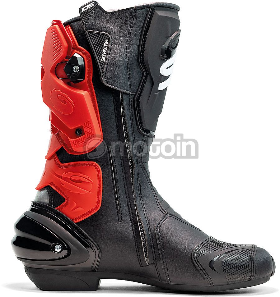 Sidi a ajouté un petit panneau élastique pour faciliter le fonctionnement de la fermeture éclair, car il permet un léger mouvement via l'élastique lorsque la fermeture éclair passe sur la cheville du coureur.